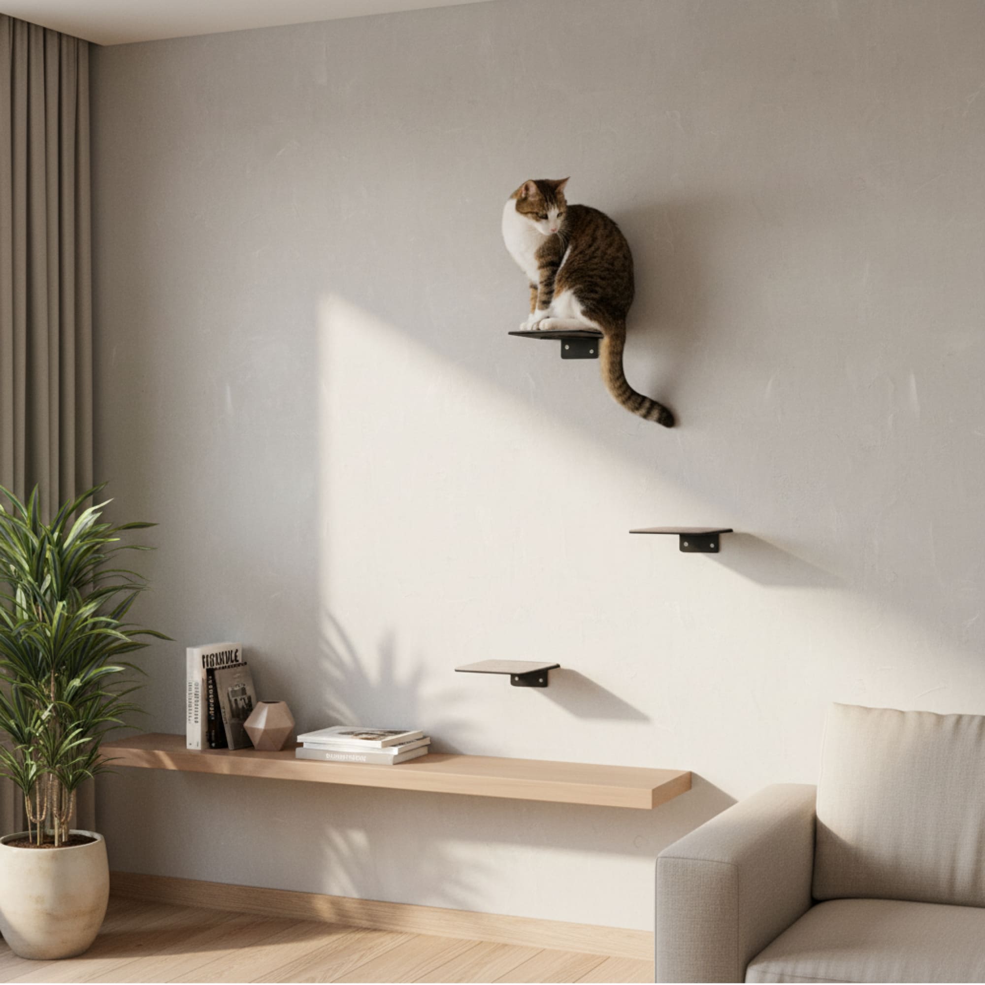 Die schlichte Kletterhilfe für Katzen von LucyBalu passt in jedes Zuhause. Katzen wollen hoch hinaus! Du möchtest zur Überwindung von größeren Distanzen eine Lösung, ohne deine Wände zu verbauen? Dann hast du mit unseren STEPS die idealen Produkte gefunden. Auch große und schwere Katzen/Kater können sich uneingeschränkt auf den filigranen Katzenstufen STEPS bewegen. Wir fertigen sie dazu aus besonders stabilem Metall. Aber rutschen Katzen nicht auf den glatten Stufen aus? Natürlich nicht! Tiergerechtes Design ist uns besonders wichtig, schließlich haben wir unsere Produkte ursprünglich für das Tierheim München entwickelt. Unsere Katzenstufen haben zum Beispiel abgerundete Ecken, damit sich Katzen nicht verletzen können. Und die Anti-Slip Pulverbeschichtung mit leichter Struktur sorgt dafür, dass deine Katze gut Halt findet. Falls dir die Kletterstufen zu "rutschig" oder zu schlicht wirken, kannst du unsere beigefügten PADS aufbringen. Erweitere den Bewegungsspielraum deiner Katze mit kaum sichtbarer Veränderung deines Wohnraums! Das minimalistische Design der STEPS sorgt für Klarheit und Eleganz. Gleichzeitig erschaffst du mit wenigen Stufen (oft reicht eine Stufe) eine Verbindung vom Boden zu einer Liege- oder Aufstiegsfläche. Die STEPS werden im 3er-Set verkauft und lassen sich beliebig – beispielsweise mit unserer Hängematte SWING, Liegebrett STRAIGHT oder der Aufstiegshilfe WAVE kombinieren.Für Katzen, die hoch hinaus wollen.